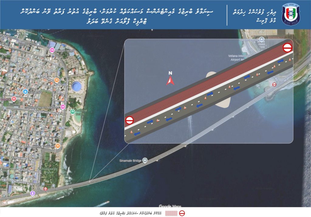 ބްރިޖްގެ އުތުރު ލޭން ބަންދުކުރުމުން މާލެއިން ހުޅުމާލެއަށް ދިއުމަށް އަދި ހުޅުމާލެއިން މާލެ އައުމަށް ބޭނުންކުރާނީ ބްރިޖްގެ ދެކުނު ލޭނެވެ.