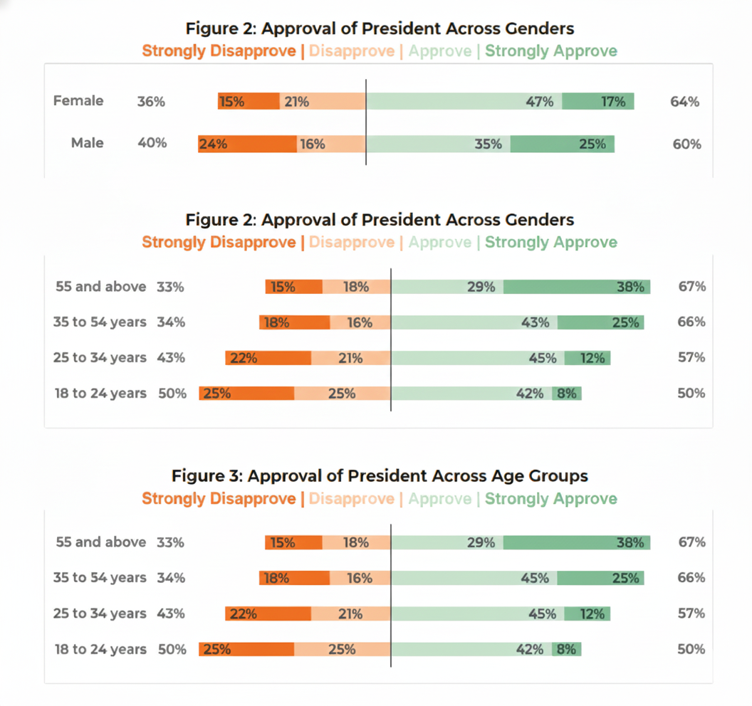 ރައީސް މުއިއްޒުގެ މަސައްކަތާމެދު ޖުމްލަ ގޮތެއްގައި ހިތްހަމަޖެހޭކަން ފާޅުކުރި 62 ޕަސެންޓް މީހުންގެ ތެރެއިން 21 ޕަސެންޓް މީހުން އެމަނިކުފާނާމެދު ވަރަށް ”ބޮޑަށް ހިތްހަމަޖެހޭކަމަށް“ ބުނެފައިވެ އެވެ. މީގެ އިތުރުން، 41 ޕަސެންޓް މީހުން ވަނީ އެމަނިކުފާނުގެ މަސައްކަތާ މެދު ހިތްހަމަޖެހޭކަން ފާޅުކޮށްފަ އެވެ.