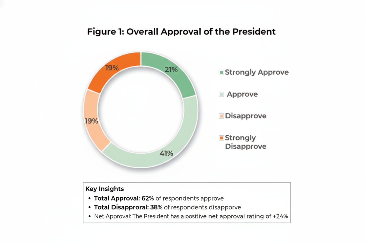 ރައީސުލްޖުމްހޫރިއްޔާ ޑރ. މުހައްމަދު މުއިއްޒު، އެމަނިކުފާނުގެ މަސައްކަތުގެ މަސްއޫލިއްޔަތުތައް ފުރިހަމަ ކުރައްވާ ގޮތާމެދު ވޯޓުލާ އާބާދީގެ (60 ޕަސެންޓަށް ވުރެ ގިނަ) މީހުން ހިތްހަމަޖެހޭކަމަށް ބާނީ ސެންޓަރ ފޯ އިންޓަނޭޝަނަލް ޕޮލިސީ (ބާނީ ސެންޓަރ) އިން ހެދި އޮޕީނިއަން ޕޯލްއަކުން ދައްކައިފިއެވެ.